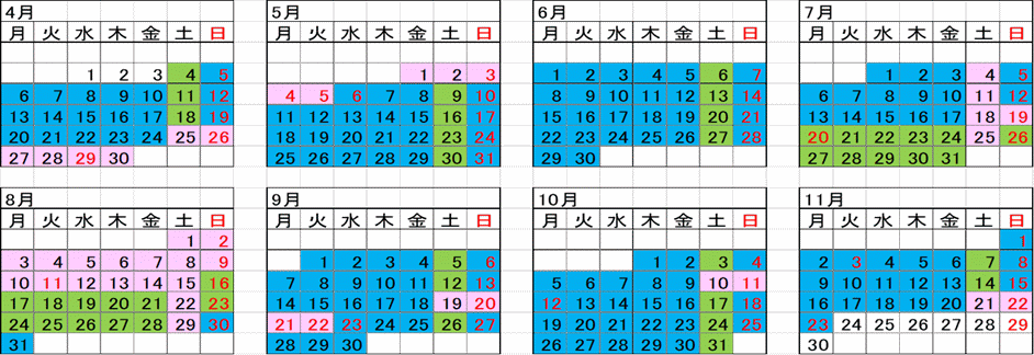 4月25日~5月5日 7月4日・11日・18日・19日・25日 8月1日~15日・22日・29日 9月19日~22日 10月10日・11日 11月21日・22日